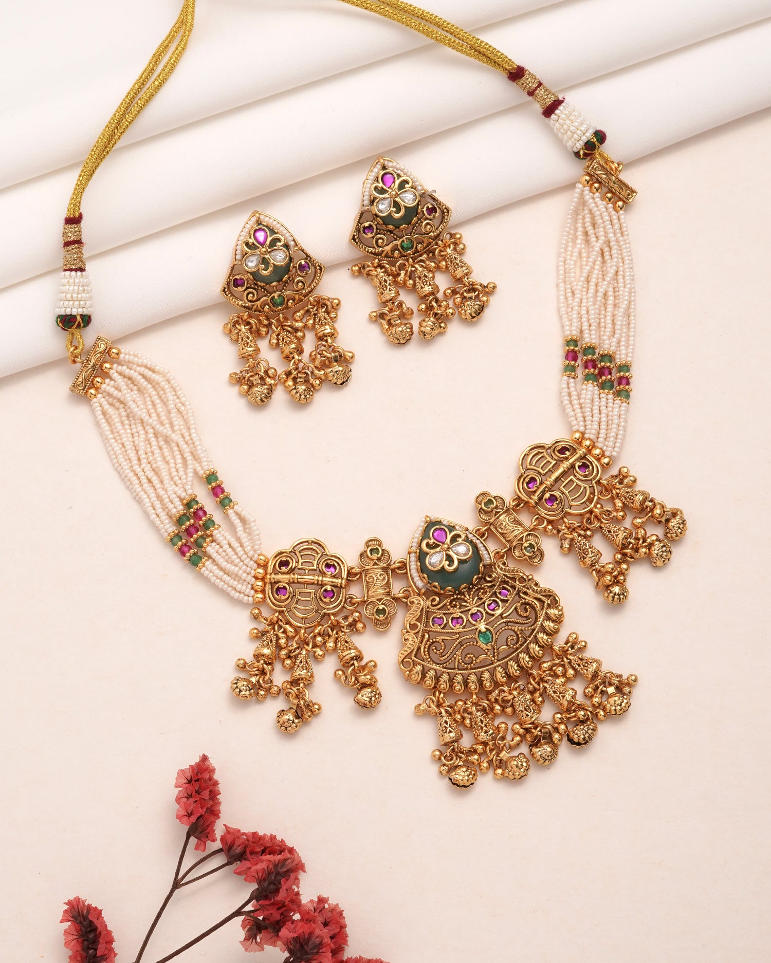 Traditional Gold Tone Floral Necklace Set with Green Stones