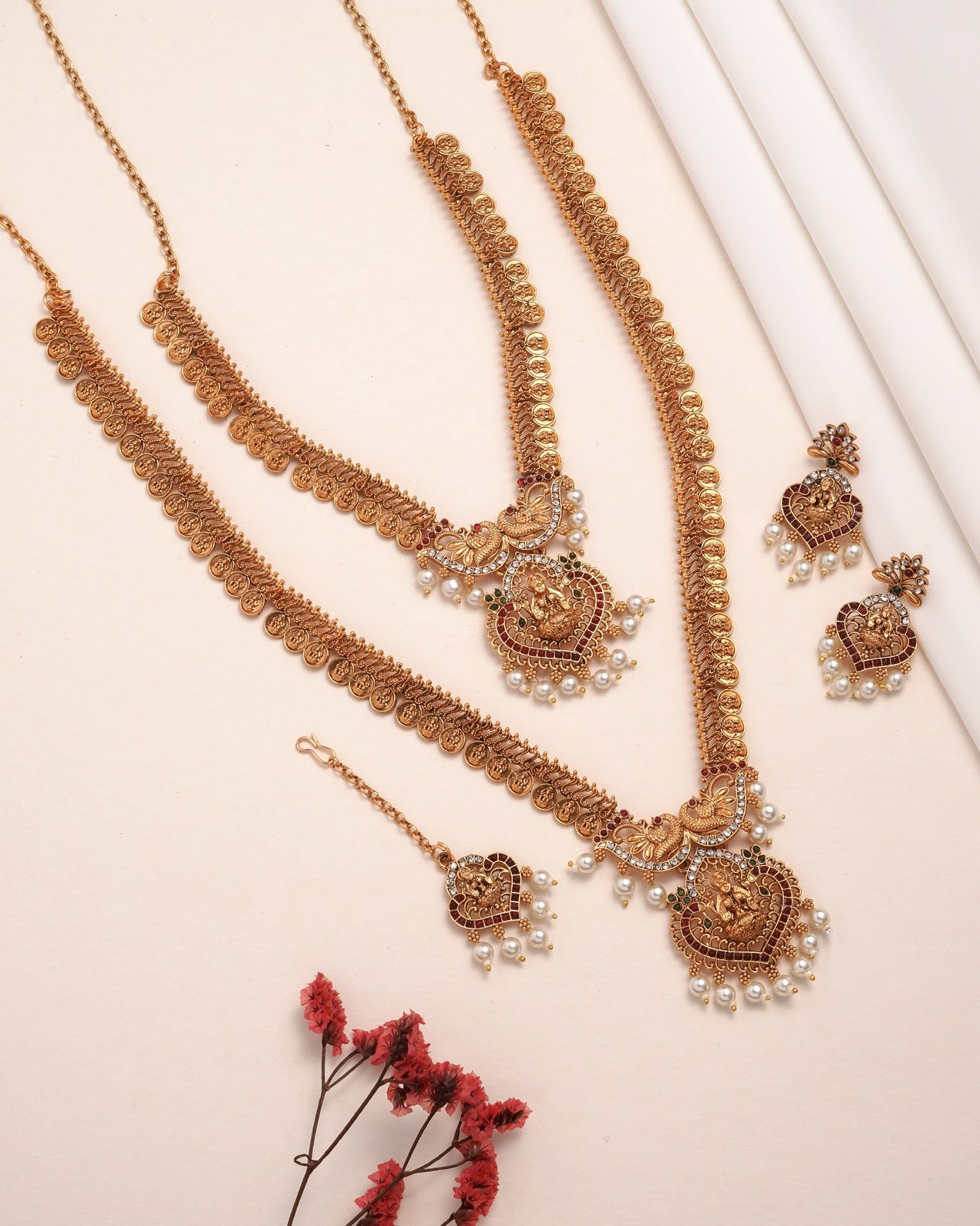 Traditional Lakshmi Coin Temple Necklace Set with Earrings & Maang Tikka
